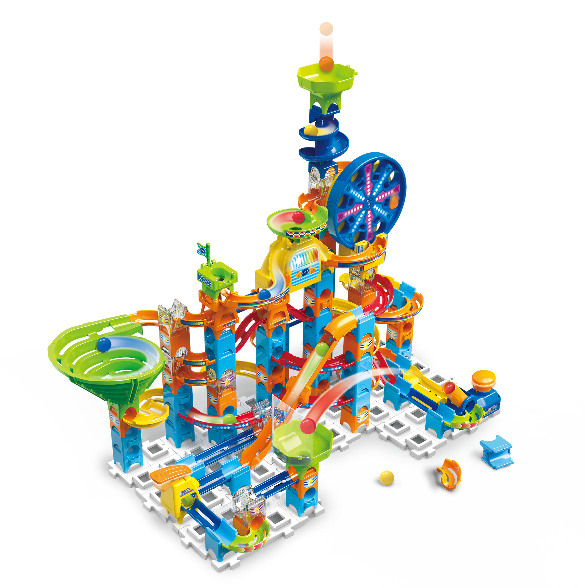 This 145-piece color-coded building set includes a spinning Ferris wheel, a swirling cone that plays a musical light show, thrilling ramps, fast tracks, extreme launchers and bases that all easily connect together.