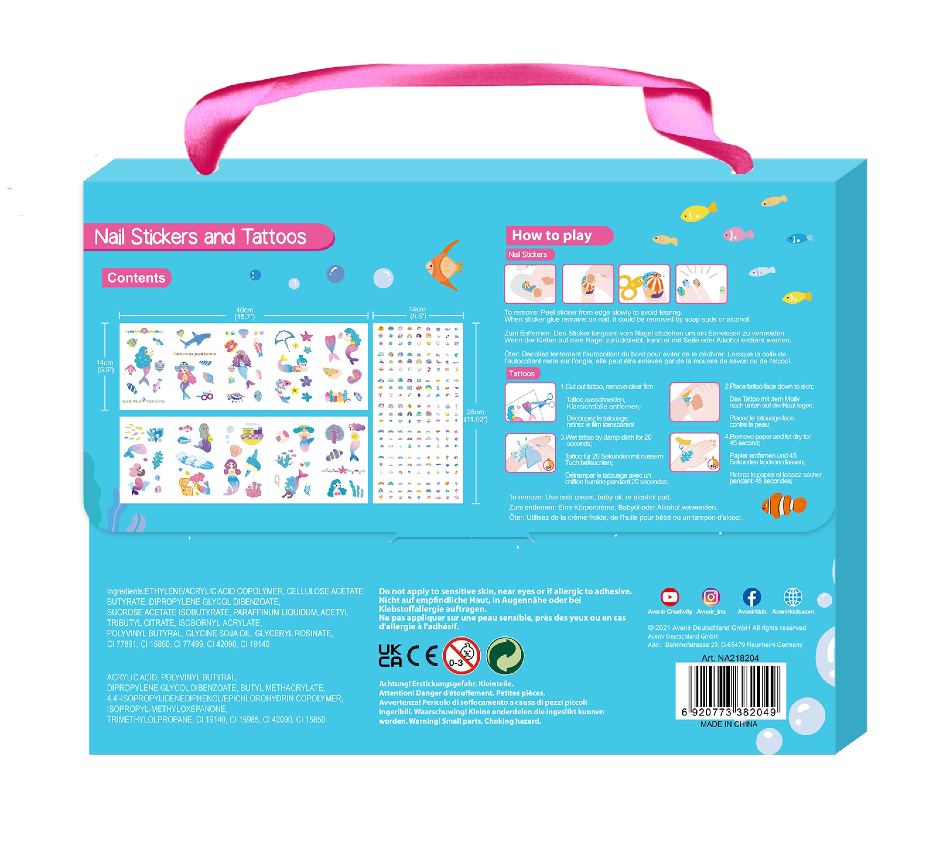 Super trendy and colourful kids Mermaid themed nail stickers and tattoo fashions! In this kit are 3 big sheets with over 260 temporary nail stickers and tattoos. Wear them out and about and make your own fashion statement! Ages 3yrs+. Distributed in New Zealand by Holdson.