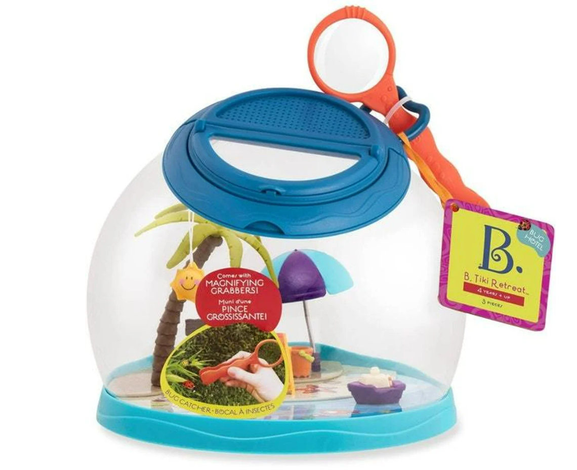 Treehoppers, Ladybugs, caterpillars...There's room for plenty at the bug hotel. Become quite the bug expert with this fabulous bug hotel from b toys. Grab the budget-friendly tweezers, find a Beetle or a caterpillar and pop it in this kids' bug catching kit. Discover tiny Crawlers and all their wonders. With a convenient handle, a ventilated lid, a tropical design, bright colors and funky features, the Tiki retreat is the coolest insect collection kit to house bugs in! This bug hotel is sure to provide splendid views with the clear dome that allows seeing them crawl from every angle possible. Comes with easy-grab tweezers that double as a magnifier. This critter catching kit is sized perfectly for tiny fingers. Have fun with the best outdoor toys for toddlers this summer! This tropical twist on a childhood classic promotes summer active play and encourages curiosity and discoveries.