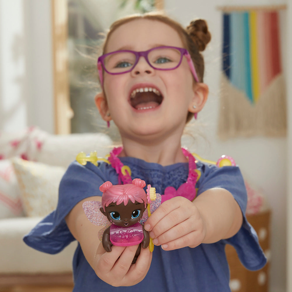 Glo Pixies Minis Carry ’n Care Necklace features on-the-go fun with a nurturing charm necklace that’s also a baby doll carrier for Rose Blossom pixie doll! This Baby Alive doll comes with a wearable charm necklace for kids featuring 7 sparkly nurturing charms, like a pretend bottle, bib, spoon, brush, bowl, teddy bear and baby wipe.