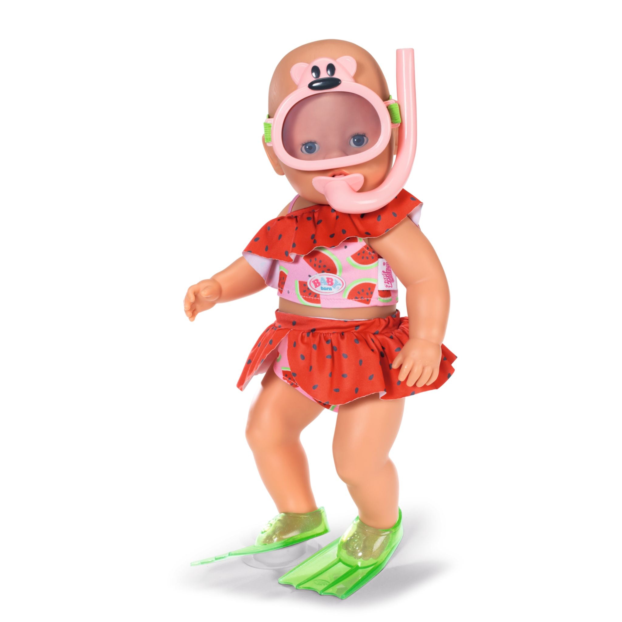 Diving has never been so stylish: With her new bikini, diving goggles with snorkel and flippers, BABY born explores the underwater world. How exciting!