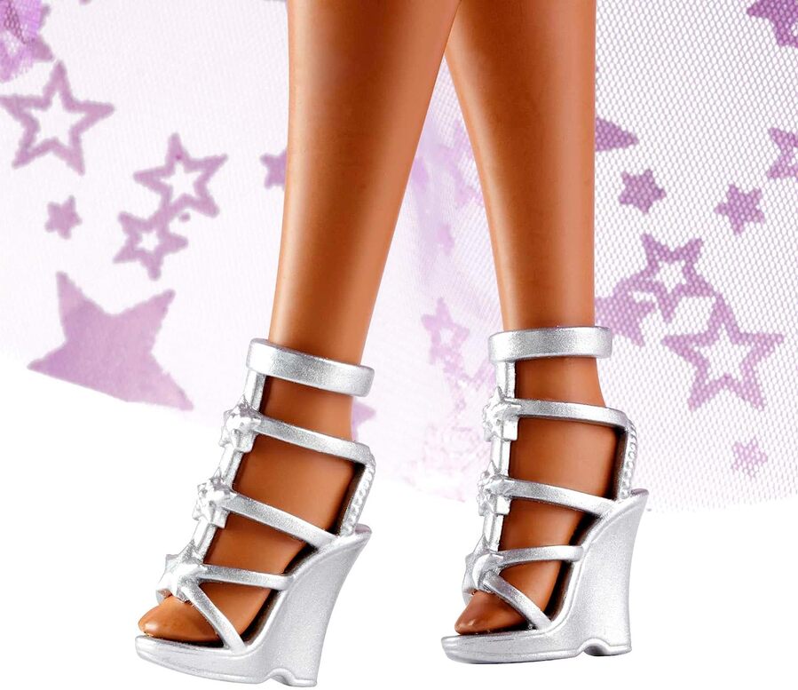 This Barbie doll can only be described as magical with her long fantasy hair and shimmering dress! Barbie "Brooklyn" Roberts doll wears a sparkly outfit inspired by her look in Barbie A Touch of Magic. Two pets and styling accessories add to the fantastical fun! Doll cannot stand alone. Colors and decorations may vary.