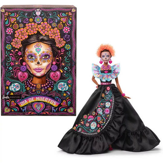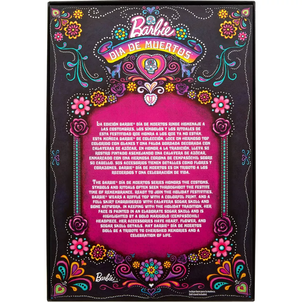 The Barbie Día De Muertos series honors the customs, symbols and rituals often seen throughout this festive time of remembrance. Barbie doll is a sight to behold in a beautiful black dress complemented by ruffles and embroidery-inspired artwork. A “marigold” headpiece and statement jewelry frame her stunning calavera face paint. May the 2024 Día De Muertos Barbie doll become a treasured keepsake and holiday tradition! Includes doll stand and Certificate of Authenticity. Doll cannot stand alone. Colors and decorations may vary.