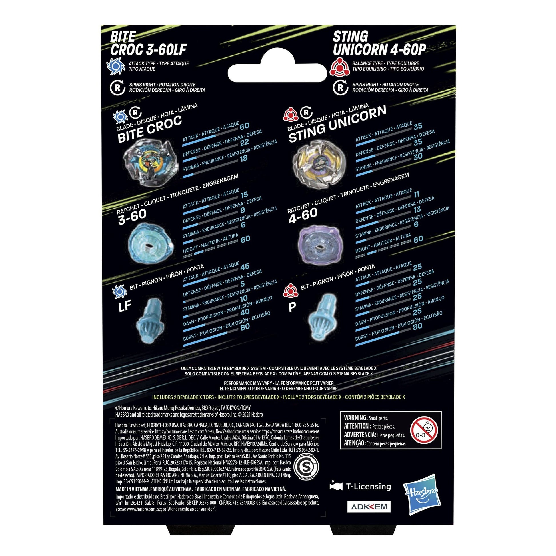 HARNESS THE POWER: Includes 2 Takara Tomy-designed Beyblade X tops with authentic die-cast metal parts: Bite Croc 3-60LF Right-Spin Attack Type and Sting Unicorn 4-60P Right-Spin Balance Type
