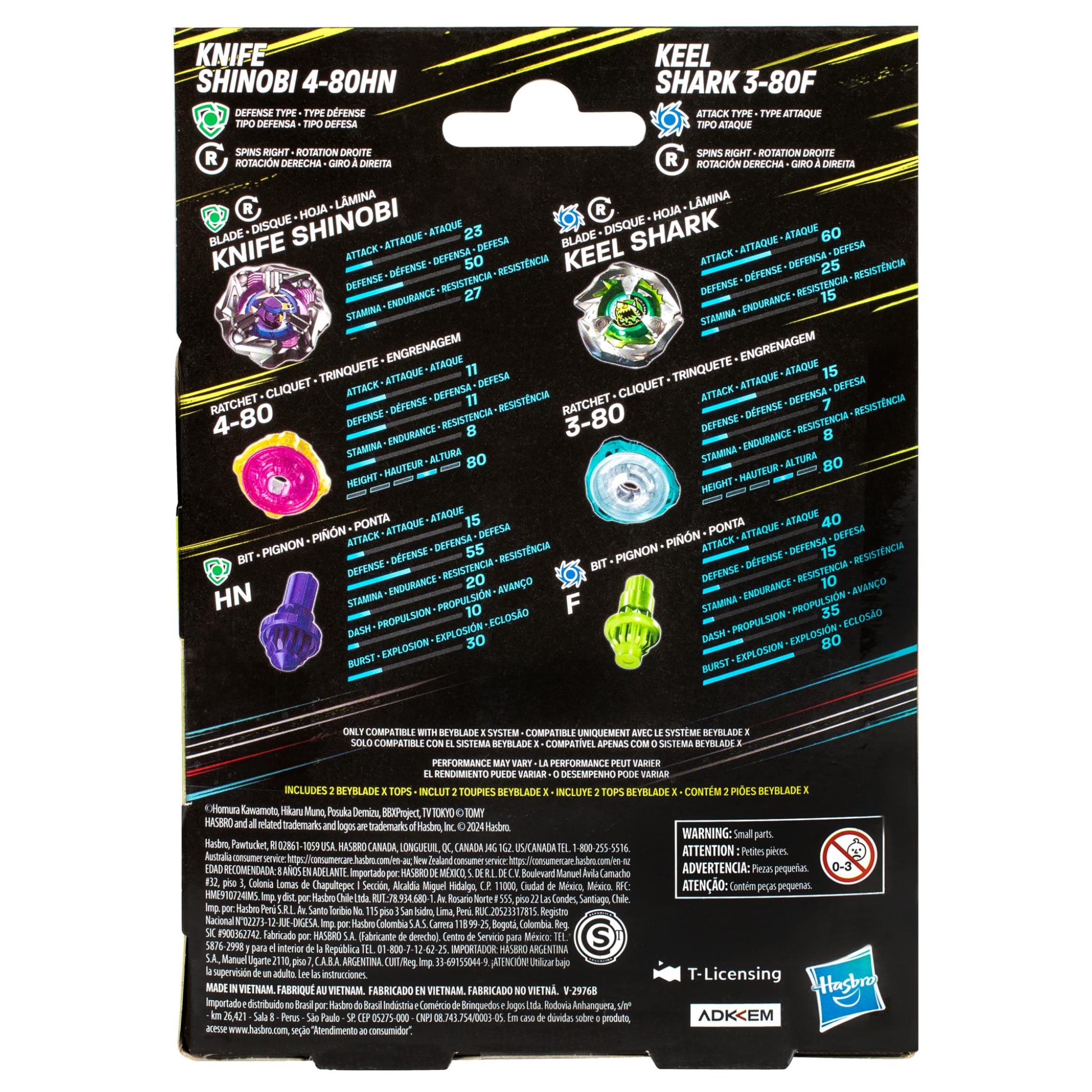 HARNESS THE POWER: Includes 2 Takara Tomy-designed Beyblade X tops with authentic die-cast metal parts: Knife Shinobi 4-80HN Right-Spin Defense Type and Keel Shark 3-80F Right-Spin Attack Type.