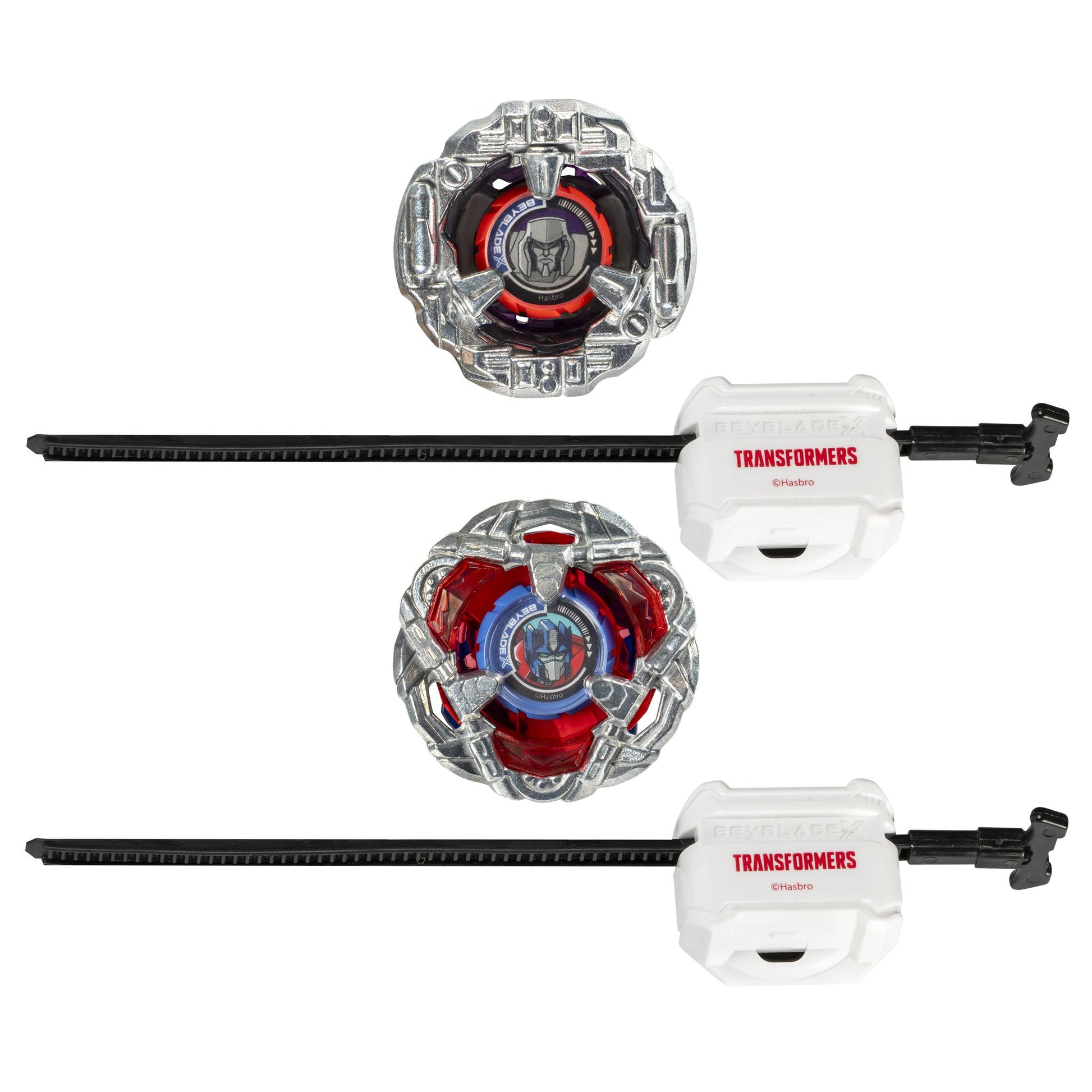 HARNESS THE POWER: Includes 2 Takara Tomy-designed Beyblade X tops with authentic die-cast metal parts: Optimus Prime 4-60P Right-Spin Balance Type with Defense Type blade and Megatron 4-80B Right-Spin Stamina Type with Balance Type Blade; and 2 launchers