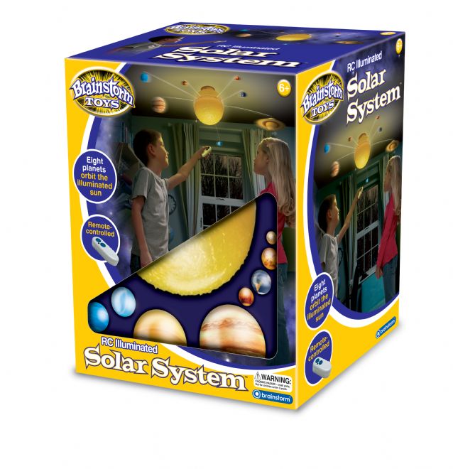 Children can experience the wonder of the solar system and learn about the planets with this fascinating and educational toy. An impressive accessory for any room! The 85cm diameter motorised solar system model has eight colour planets that rotate on three independent orbits. Auto shut-off saves battery life. Mounts to ceiling with enclosed fixings. Battery operated and remote-controlled. With educational colour booklet