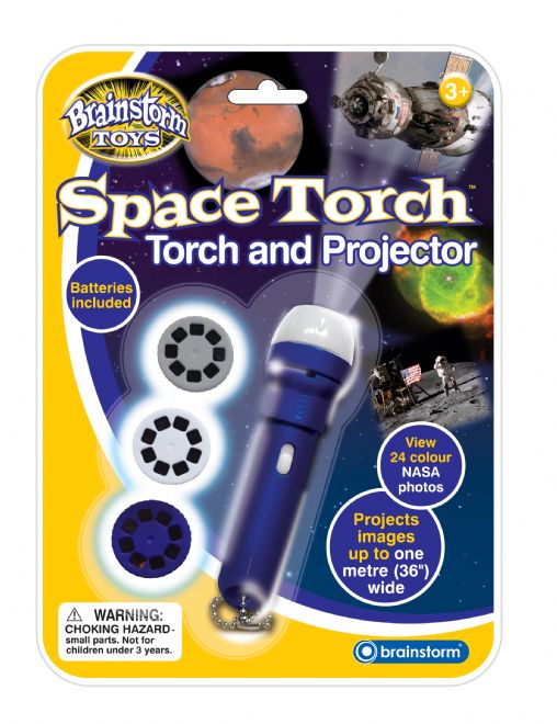 This handy torch is also a photo projector. Has 24 colour NASA and Hubble Telescope photographs, on three changeable slide disks. Projects images up to one metre wide. Turn lens head to focus. Batteries included.