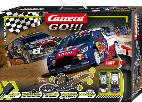 With the Citroën DS3 WRC, Sébastian Loeb won the Monte Carlo Rally right from the start with a 2-minute 45-second advantage. That could only be good. Later, Loeb acknowledged the talent of his compatriot Stéphane Lefebvre and supported him from then on. Lefebvre achieved his best result with the race car in Great Britain with eighth place. Mads Østberg switched to the Citroën DS3 WRC in 2014 and then spent two years driving for the Citroën Total Abu Dhabi WRT team.So that you too can get to know the attraction of the dusty and slippery rally races, this is what is on offer with Carrera GO!!! The 4.9-metre-track on a scale of 1:43 gives you the feeling of being at home. The two racing cars Citroën DS3 WRC on a scale of 1:43 differ only by their paint finish. The track elements with straight and narrow sections in a special rally design provide further sophisticated elements for your race track. By pressing the turbo button on the controller, you can really step on the gas - especially in the looping section. In addition to the race track, the two slot cars and the two speed controller, the set also includes a transformer, a lap counter and the accessories for the track.