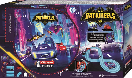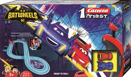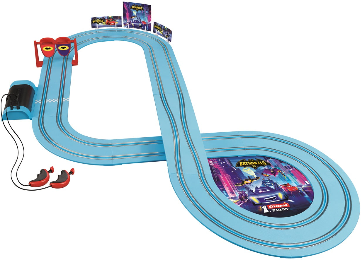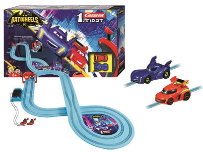 Gotham Batwheels Battle to Victory on the Carrera FIRST racetrack Bam and his companion Redbird, Robin's car, join the action on the Carrera FIRST racetrack. The ‘Batwheels Ready to Roll’ set sees the two little supercars race around the blue 2.9-metre/9.51 ft. racetrack circuit. Playful extras like the pinball machine and bottleneck section ensure even more fun, and numerous decorative elements from the series guarantee smiles and authentic Batwheels thrills!