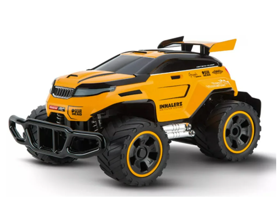 Start thrilling outdoor adventures with Carrera RC! The Carrera RC Gear Monster 2.0 roughs up the terrain wherever you drive. This mighty bright orange offroad specialist is fitted with large pneumatics for a cool dirt and gravel ride. Friends wil be impressed by exciting outdoor tours, and enjoy riding the bumps together. In it to win it! Full function control technology also gives Gear Monster 2.0 great handling away from the racetrack and it can be seamlessly steered in all directions. This beast is around 28cm in length and shines at top speeds of up to 12 km/h, gaining fans on high-speed lone expeditions or races for up to 16 vehicles. Racing can go on for up to 20 minutes, before the LiFePo4 battery is given a short and convenient 50-minute recharging break via the USB cable included in the box.