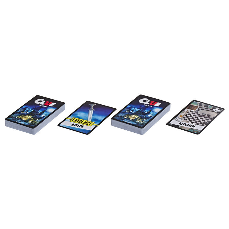 The Classic Mystery Board Game now has a twist as a fast, fun card game! In this version of the Clue game, players use Evidence cards and Case File cards to gather information and eliminate suspects, rooms, and weapons. Its an exciting strategy game as players ask questions about who did the crime, where it was done, and which weapon was used. Ready for an accusation? The cards under the Crime card must match the players accusation for them to win the game. If the cards dont match, they lose! This quick-playing card game is a convenient way to let your kids take the Clue game with them when traveling or visiting a friends house.