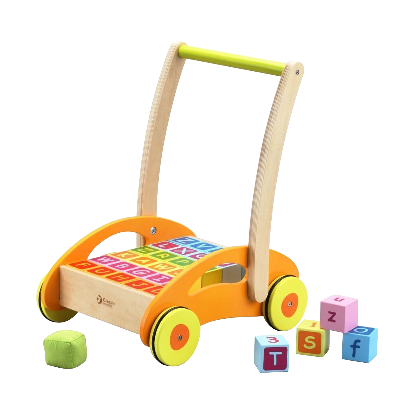 Babies and toddlers will have fun pushing the trolley and building with the blocks. As they get