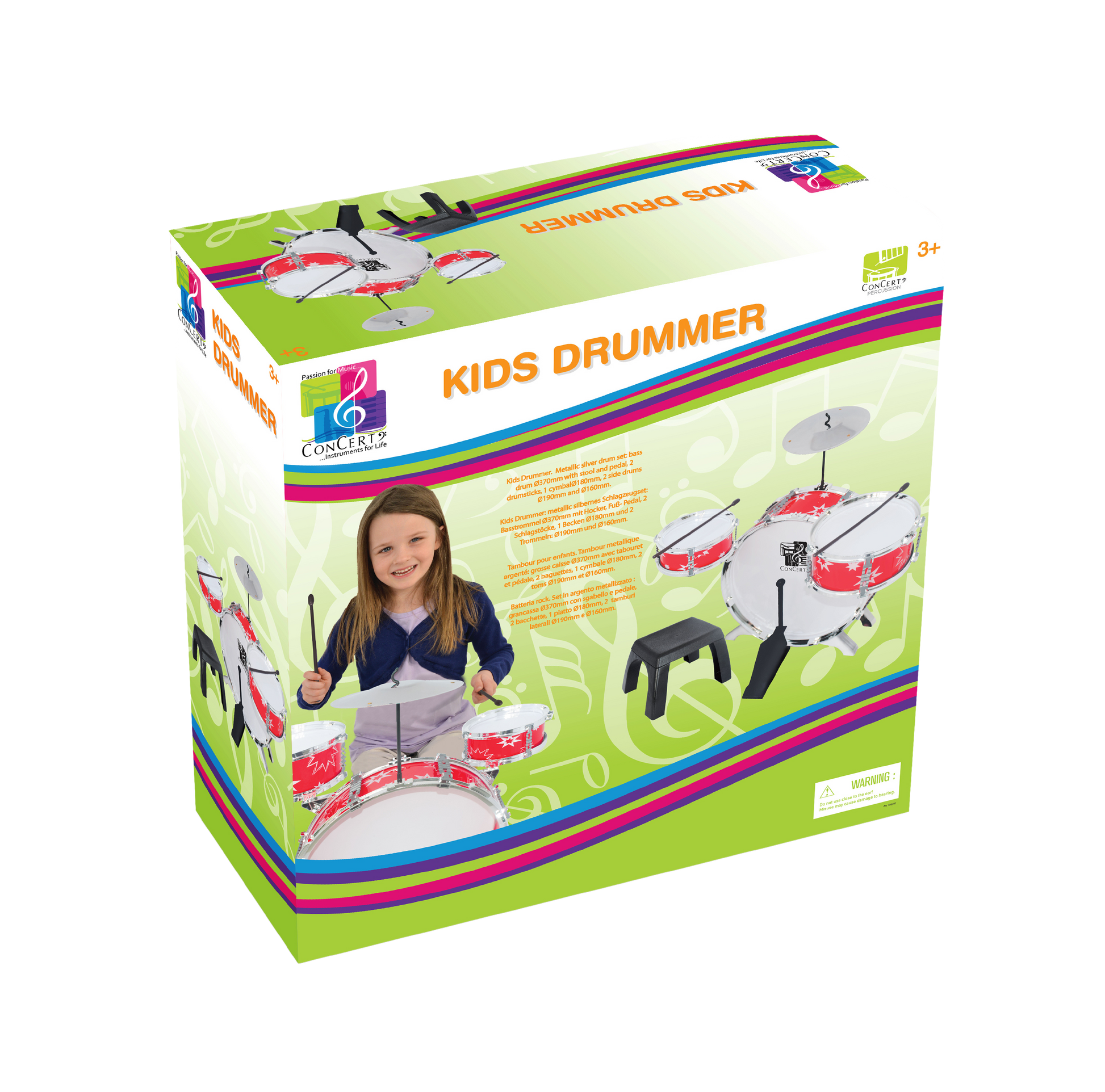 Incudes 370mm stool and pedal, 2 drumsticks, 1 cymbal, 2 side drums.