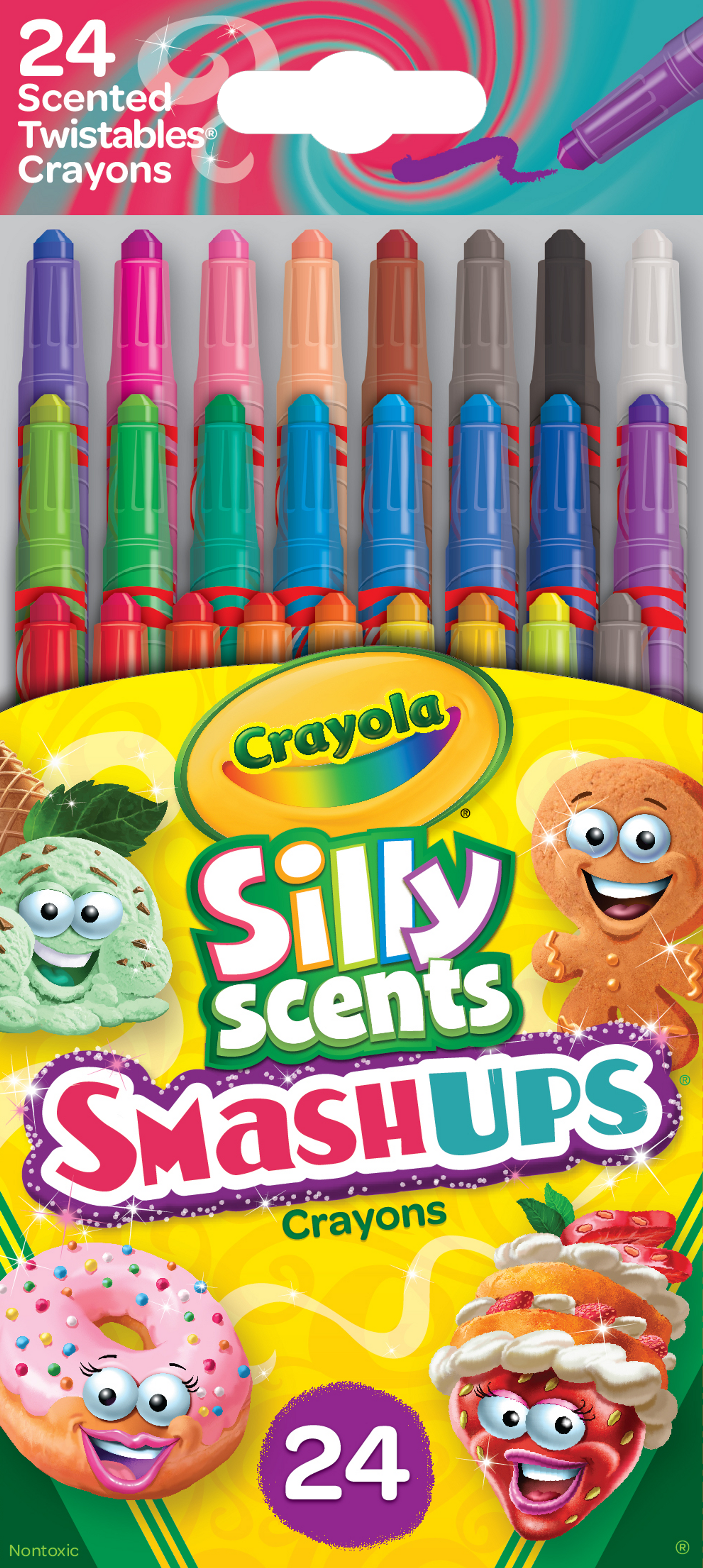 The Crayola Silly Scents Twistables Crayons you know and love—now available in Smash Ups! This scented crayon set features sweet-smelling scents including Orange Dreamsicle, Orange Gingerbread Cookie, Banana Cream Pie, Lemon Bar, Key Lime Pie, Cinnamon Churro, Mint Chocolate Chip, and more. No sharpening is required for these crayons, allowing you to colour on the go without a sharpener needed. Plus, scented school supplies are the perfect way to celebrate back to school and get kids excited to create! Each of these Crayola scented crayons is washable from skin and most washable clothing, making them great for school supplies and colouring on the go. Pair them with a Crayola colouring book for a fun bundled gift idea, and make someone's day sweeter. FEATURES & BENEFITS: Scented Twistables come in 24 different brilliant colours now with 24 fun smash up scents including: Orange Dreamsicle, Orange Gingerbread Cookie, Banana Cream Pie, Lemon Bar, Key Lime Pie, Mint & Lime Tea, Mint Chocolate Chip, Apple Pie, Berry Smoothie, Blueberry Cheesecake, Plum Pudding, Cotton Candy Grape, Red Velvet Cake, Chocolate Covered Strawberry, Raspberry Macaron, Peach Cobbler, Coconut Cluster, Strawberry Shortcake, Strawberry Banana Milkshake, Upside-Down Cake, Cinnamon Churro, Chocolate Covered Popcorn, Root Beer Float, Rainbow Donut Twist-up barrel eliminates the need to sharpen tips or peel labels Plastic barrels encase durable colour cores providing extra strength. CONTENTS: 24 Twistables scented crayons