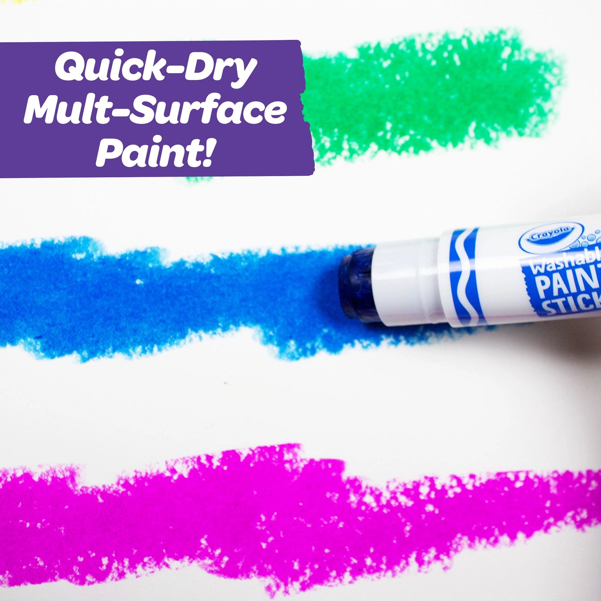 Crayola Washable Paint Sticks go on like a glue stick, but look just like paint. They offer full coverage and are designed to work on a variety of surfaces. This less-mess kids' paint set includes 6 Washable Paint Sticks in assorted colours: Red, Yellow, Green, Blue, Purple and Orange.