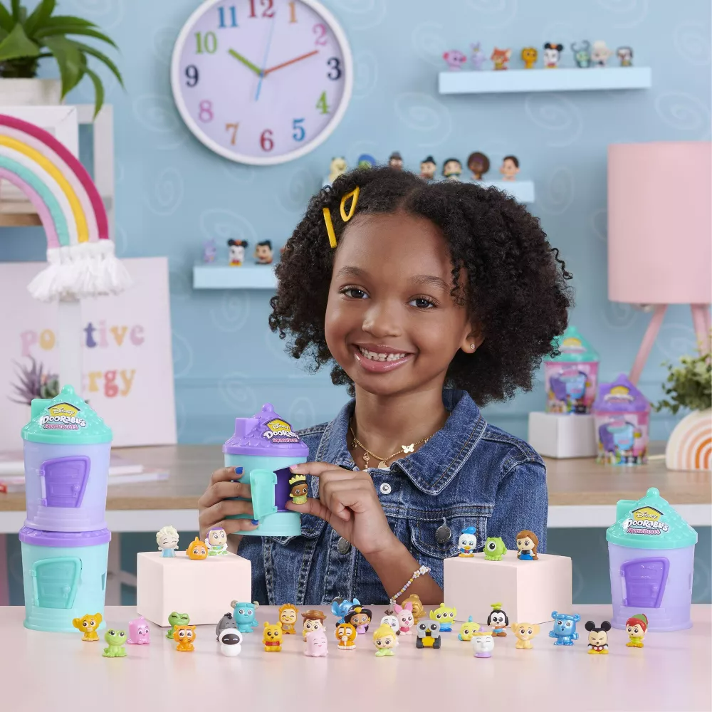 Open the front door to find the first blind bag. Then, twist the roof of the tower-shaped capsule to find additional figures. Series 1 includes 50 squishy characters from beloved Disney and Pixar films. Each stands approximately 1 inch tall and features stylized detailing with sparkly glitter eyes. Reuse the capsule container to store, display, or play with figures.