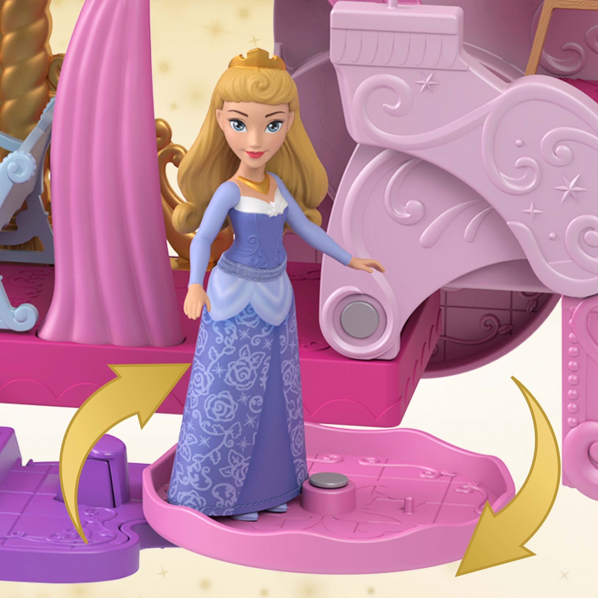The carriage then magically transforms into a castle, with 3 levels, 6 play areas, and 10+ furniture and play pieces. This 2-in-1 playset includes an Aurora small doll and 4 character friends, but it can be used with any Disney Princess small doll (others sold separately)!