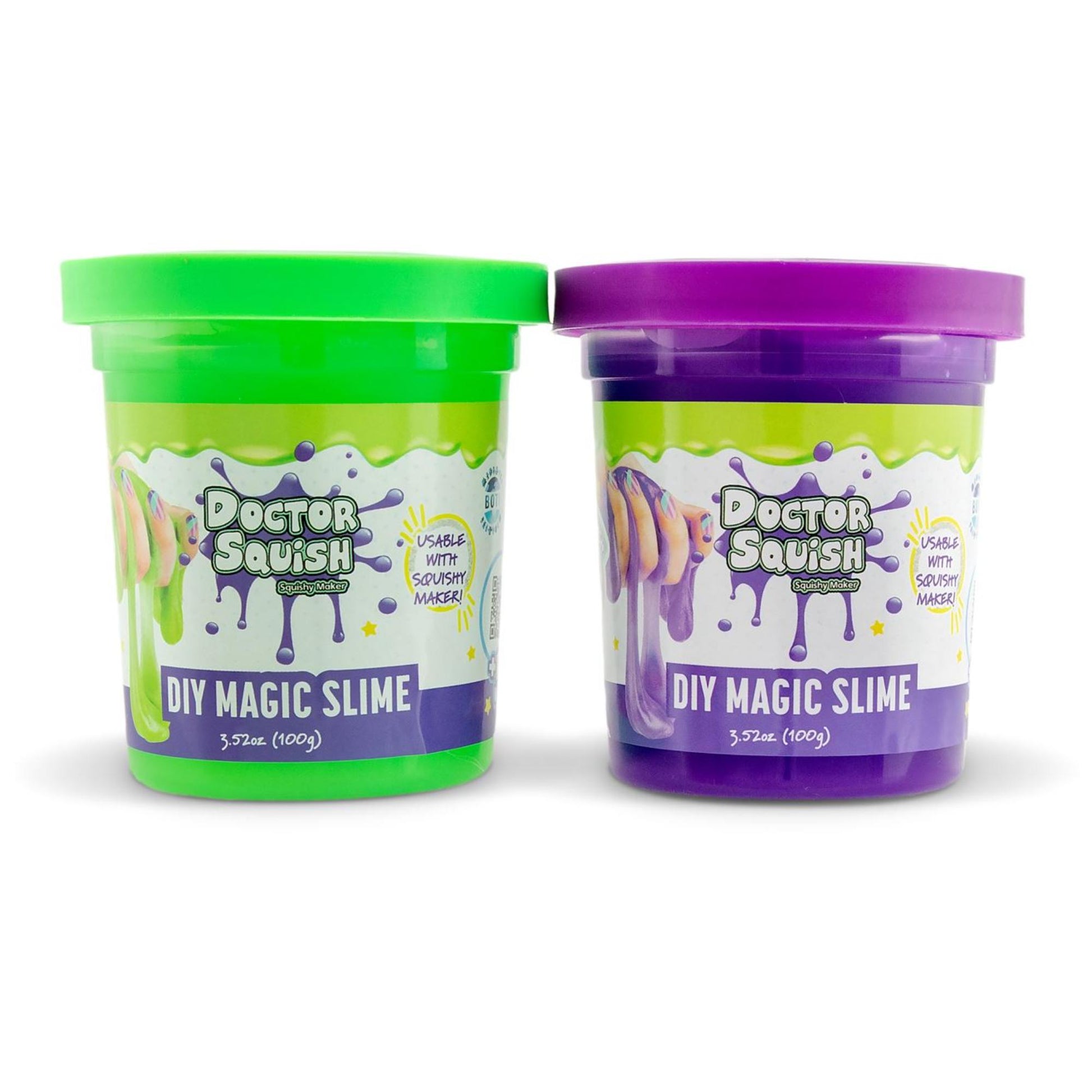Doctor Squish loves to find the best squishy toys to see what's inside! She loves making her own squishies and anything else squishiliscious! And now she has own DIY Squishy Maker and Magic Slime! The DIY Magic Slime is usable with the Doctor Squish Squishy Maker. Create and Squish the DIY Magic Slime available in green and purple.140g of slime per tub. Sparkle bag is also included.