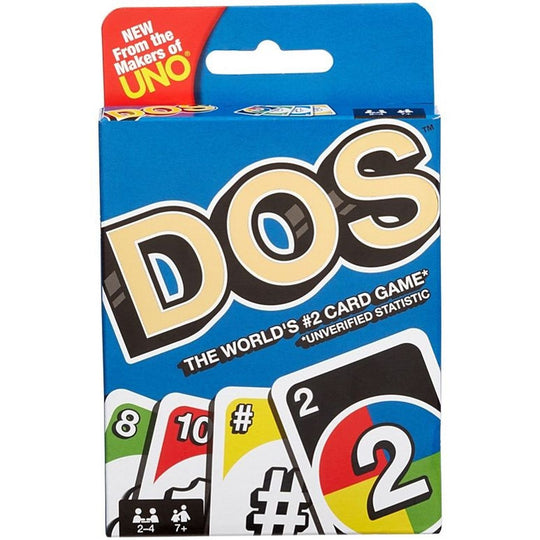 UNO™ has a new best friend, DOS™! In this fun card game, two is more important than one, and number matching is king! Just like UNO™, DOS™ involves a race to be the first to get rid of your cards. To start, there are two discard piles between the players. On each player's turn they can discard on either pile with either one or two cards, so if a player has two cards that add up to the number of a card in the center pile, they are able to put down BOTH cards. When you're down to two cards, don't forget to yell "DOS!" The first person to 200 points is the winner! The game includes a 112-card deck plus instructions. For 2 to 4 players. Ages 7 and older. Colors and decorations may vary.