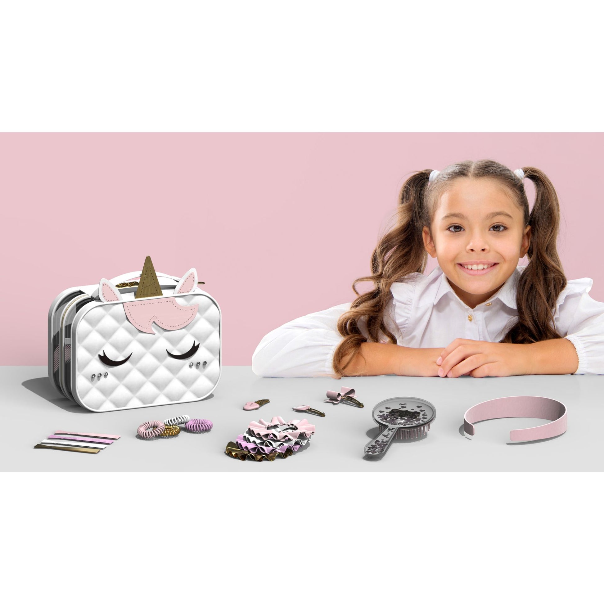 Beginner Hair Care With lots of hair ties and a fun sparkle brush. This kit is a great way to introduce kids to taking care of their own hair, for once, kids will want to brush their hair! Easy Storage, fun unicorn carrying case makes it easy to keep all your hair accessories in one place.