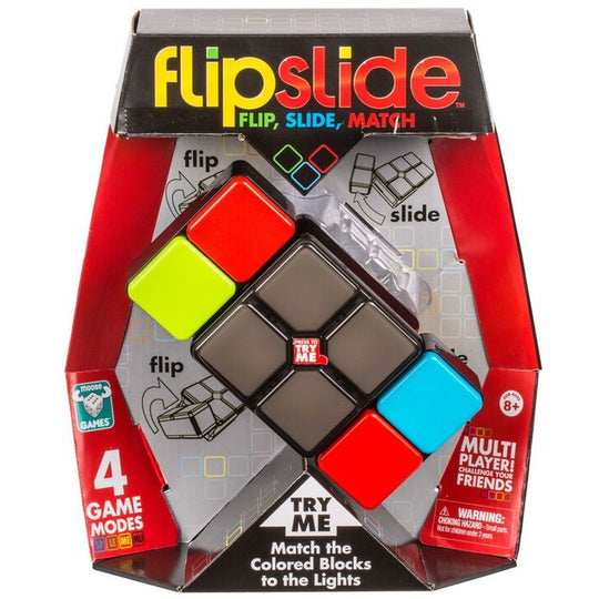Flipslide is the fun, challenging electronic matching game. Flip to find the color and slide to match the lights. There are four different game modes to choose - Beat the clock in Speed Mode, challenge your skills in Level Mode, test your memory in Memory Mode or challenge your friends in Multi-player mode. Flipslide is the take anywhere challenge you can't put down!