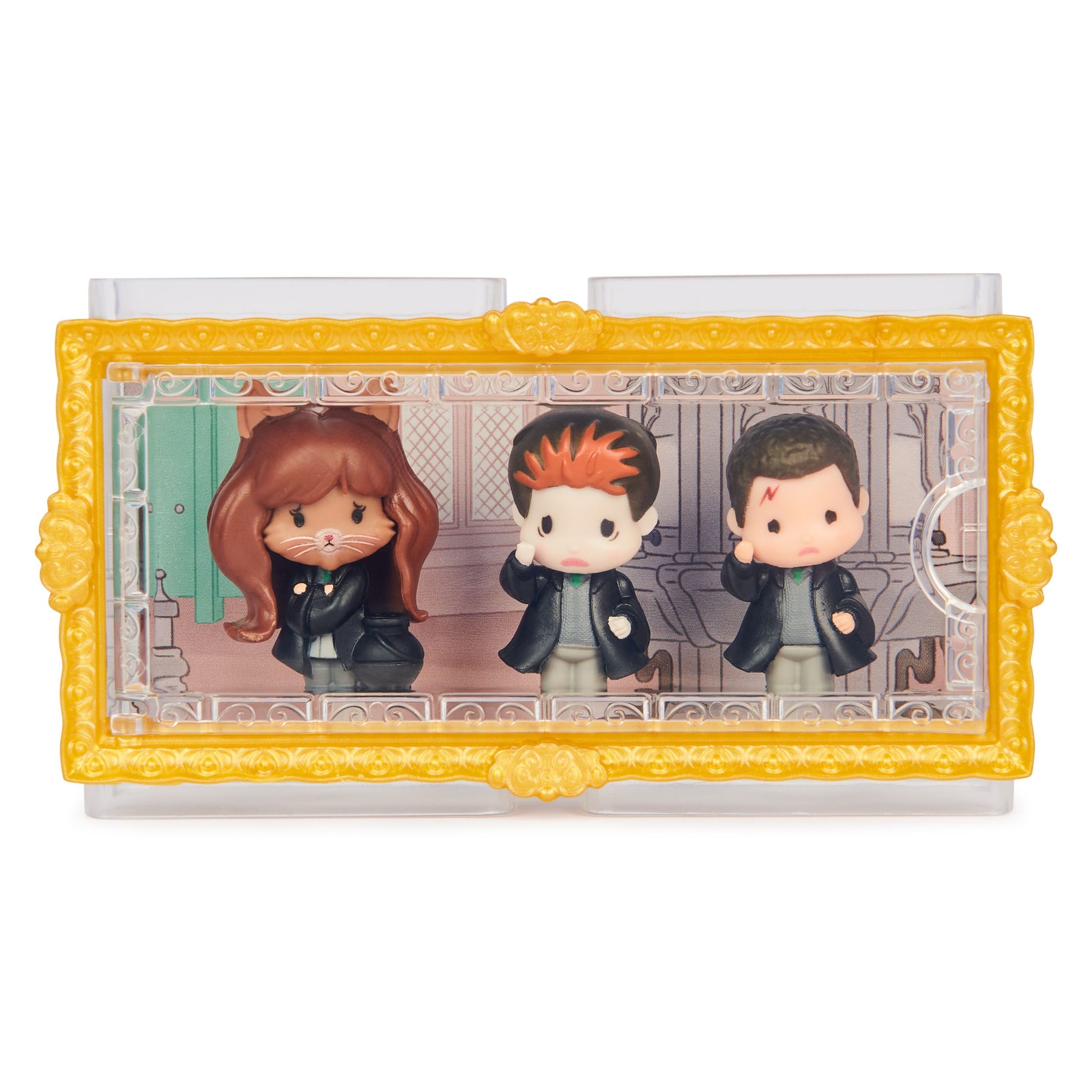This multipack includes 4cm figures of Harry Potter, Hermione Granger and Ron Weasley, a clear portrait frame display case with a double-sided backdrop, and three figure stands.