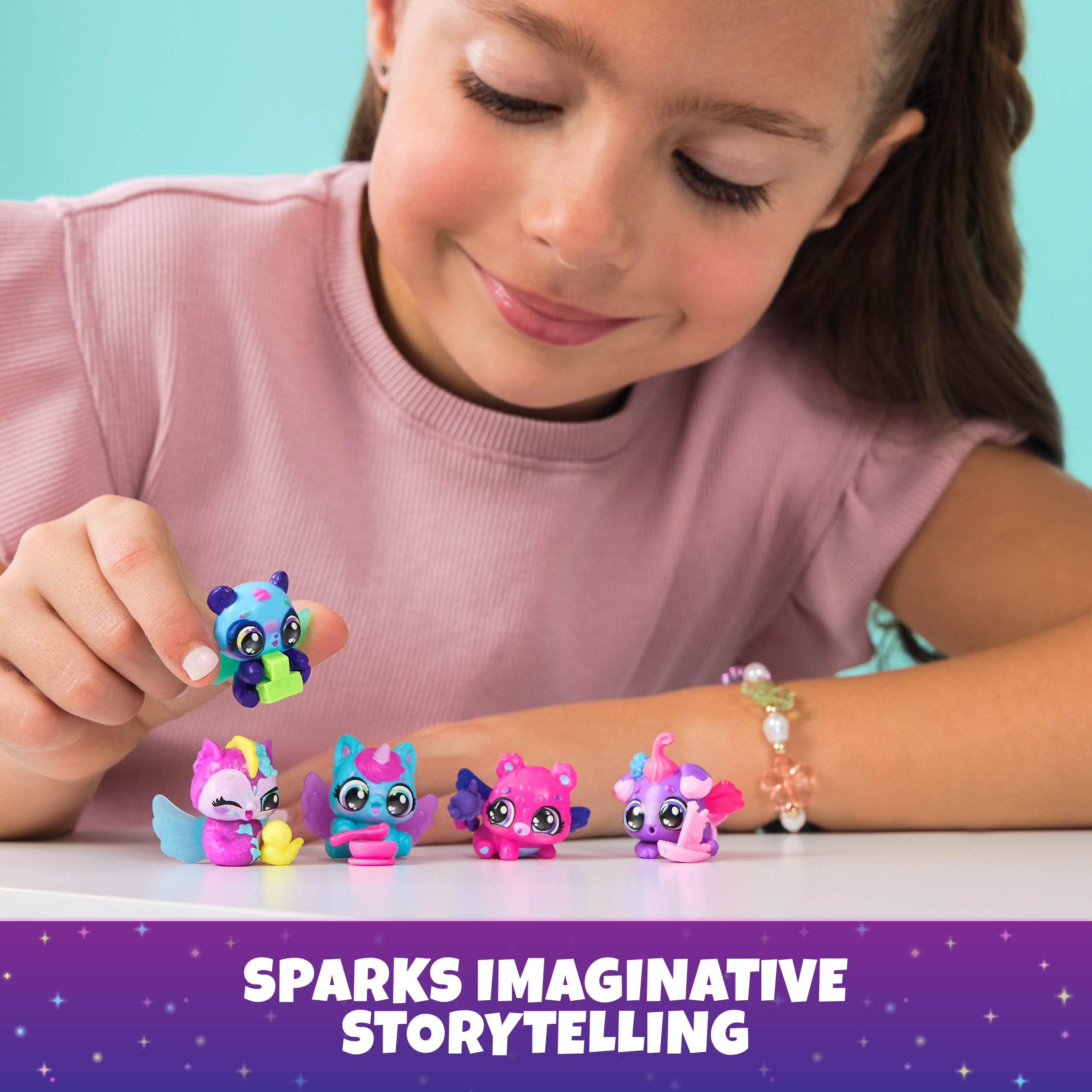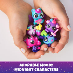 Open the sparkly lid to discover a built-in hatch zone and 5 Hatchimals eggs containing 5 characters, each inspired by Moody Midnight hues.