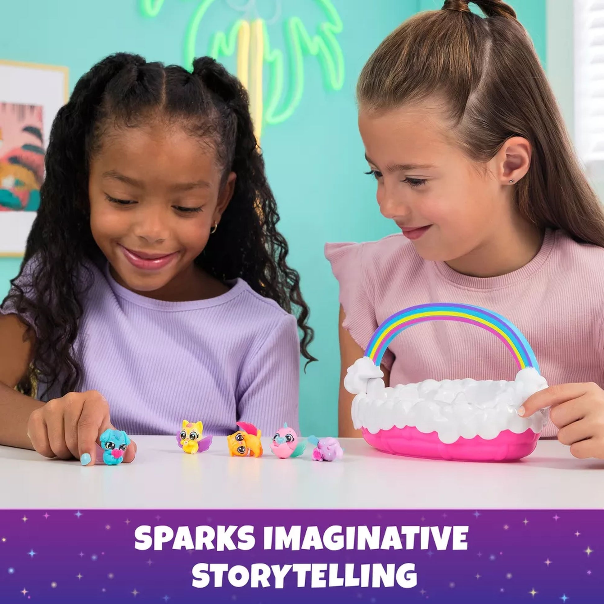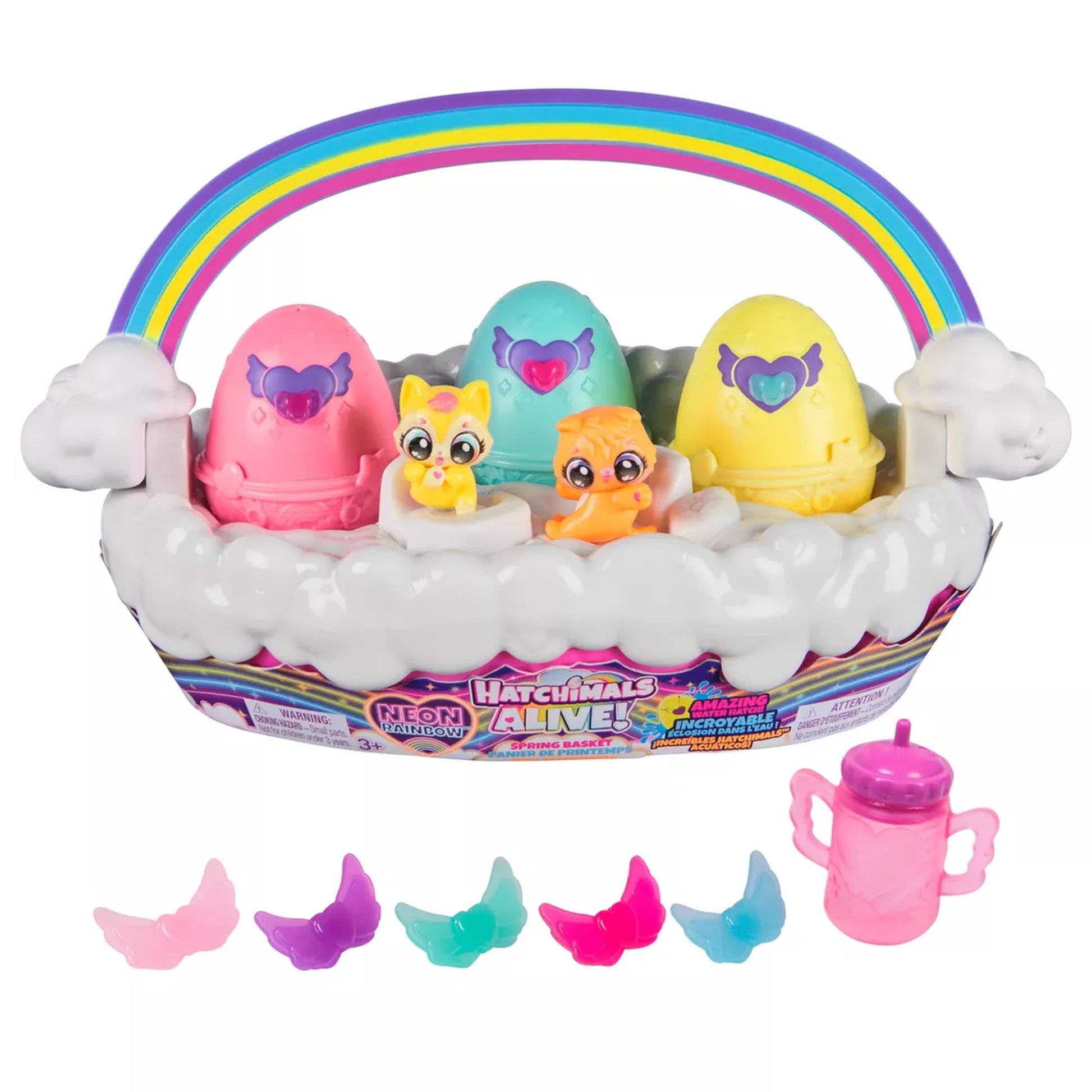 To start hatching, remove the 3 pacifiers from the eggs, fill the bottle with water and squeeze it into the eggs. In seconds, a Bunnypie, Puppadee and Narwing will start revealing themselves, cracking through the eggs. Display your characters inside the Easter basket or use your imagination to play out your own adventures. There’s a booster seat and pillow molded in the basket and the pacifiers fit into each figure’s mouth for nurturing play. Lift the rainbow handle and take your neon Hatchimals friends with you anywhere you go.