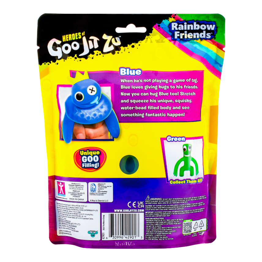 Rainbow Friends, the multiplayer, kid-friendly horror story experience has now joined with the Heroes of Goo Jit Zu to become super squishy, stretchy action figure toys! Fans can collect both Blue and Green 4.2" character figures. They have unique goo fillings! Blue is super squishy. Boys and girls can stretch both Green and Blue up to three times their size. Green is super stretchy. The best thing is they will always come back to their original shape! Heroes of Goo Jit Zu Rainbow Friends are a gooey way for kids to play with no mess.