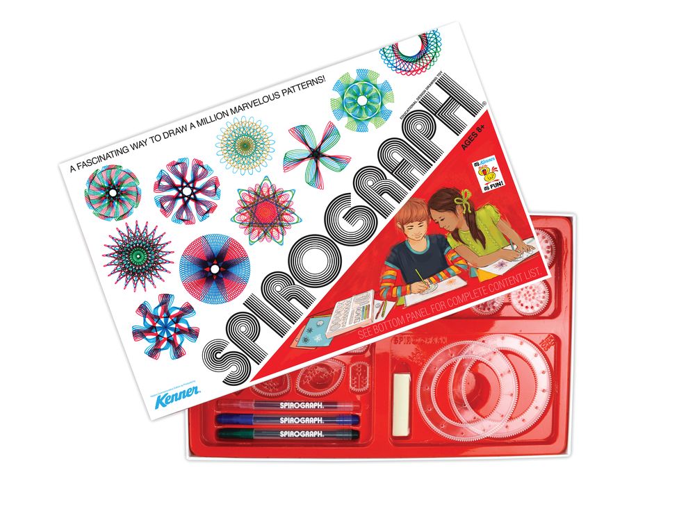 The classic way for aspiring artists to create millions of marvellous patterns is back and better than ever! Includes 19 Spirograph® Precision Wheels, 2 Spirograph® Precision Rings, 1 Spirograph® Precision Rack , .17 oz. (5g) of Reusable Spirograph® Putty, 3 Design Pens, 14-Page Guide Book, 20 Sheets of Design Paper and one storage tray. This reproduction of the classic set features all the iconic wheels and rings of the original in a retro, throwback package! Suitable for ages 8 years+.