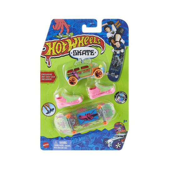 Embrace the full Hot Wheels Skate™ experience with this sweet set that includes a fingerboard and skate shoes plus one Hot Wheels® vehicle. The collection was designed in collaboration with skateboarding legend Tony Hawk, and each set has matching details featuring metallic board graphics and an exclusive Hot Wheels® vehicle. The removable shoes help kids get the feel of the board as they experiment with ollies, jumps and 360s over the included Hot Wheels® vehicle. Groms will shred like pros in no time as they master their stylish stunts just like Tony Hawk! Kids and collectors will want each set of boards, shoes and cars with their premium design execution. Each sold separately, subject to availability.