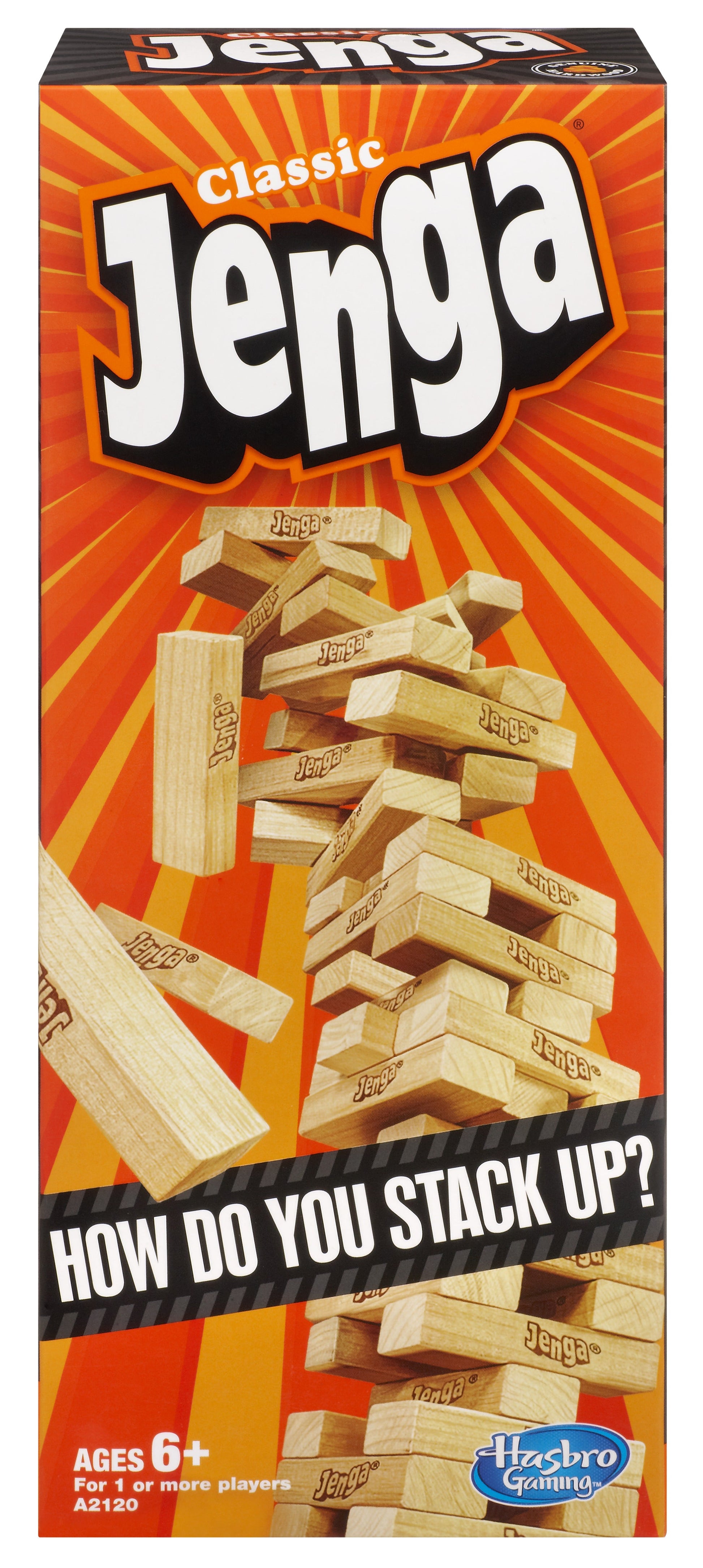 54 hardwood JENGA blocks! Win by being the last player to remove a block without causing the stack to crash! Includes stacking sleeve.