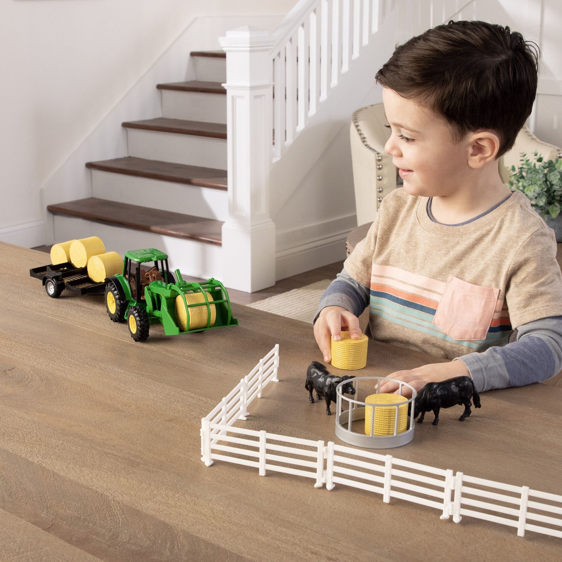 Your little farm enthusiast is going to love this 20-piece John Deere play set featuring a die-cast and plastic cab tractor with grapple bucket, a round bale hay feeder with 6 bales of hay and 2 cows with fencing.