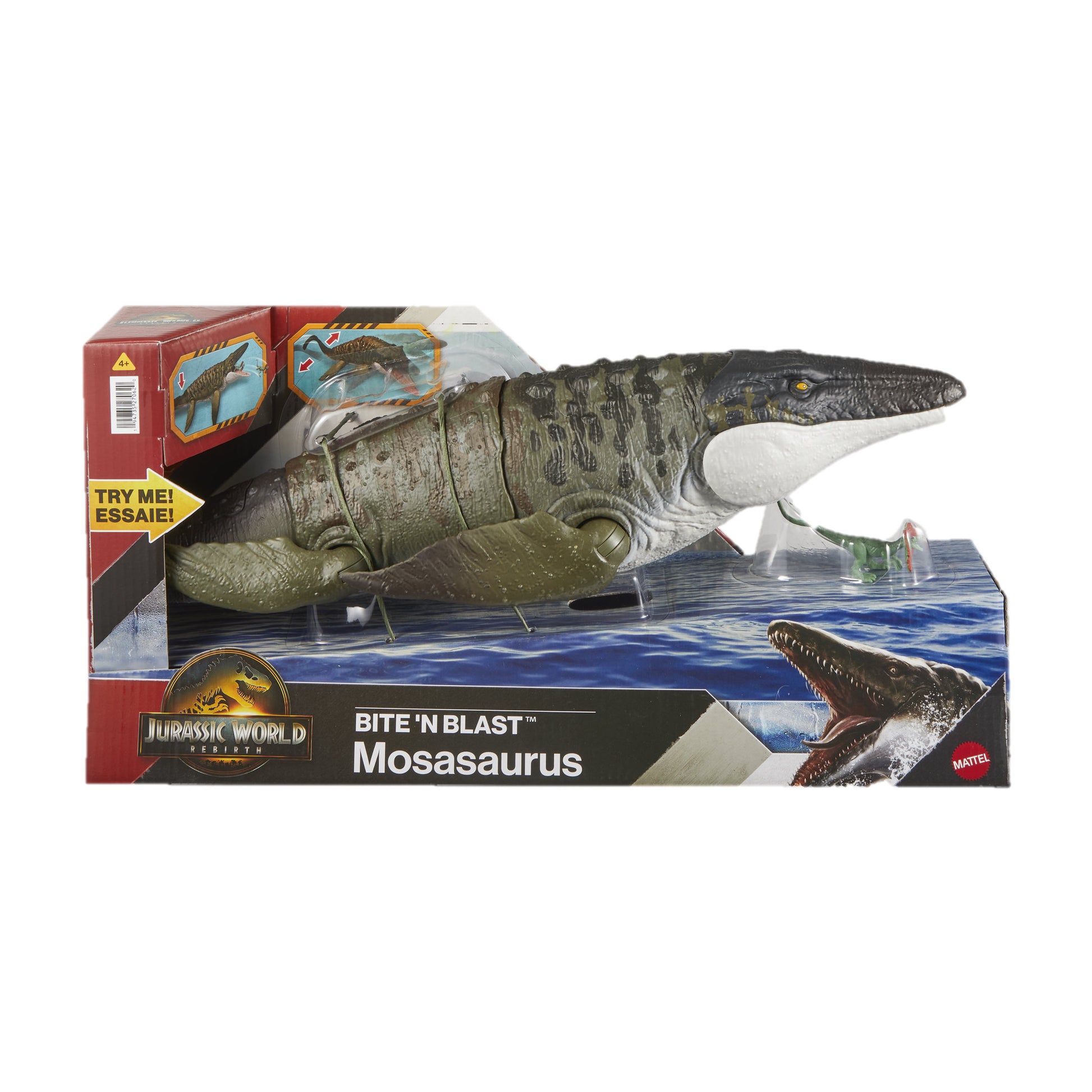 Jurassic World lives! Bring the excitement and thrills of Jurassic World Rebirth home with this distinctive Mosasaurus with exciting Bite ‘N Blast moves, articulated fins and tail and 25.7-inch long size!