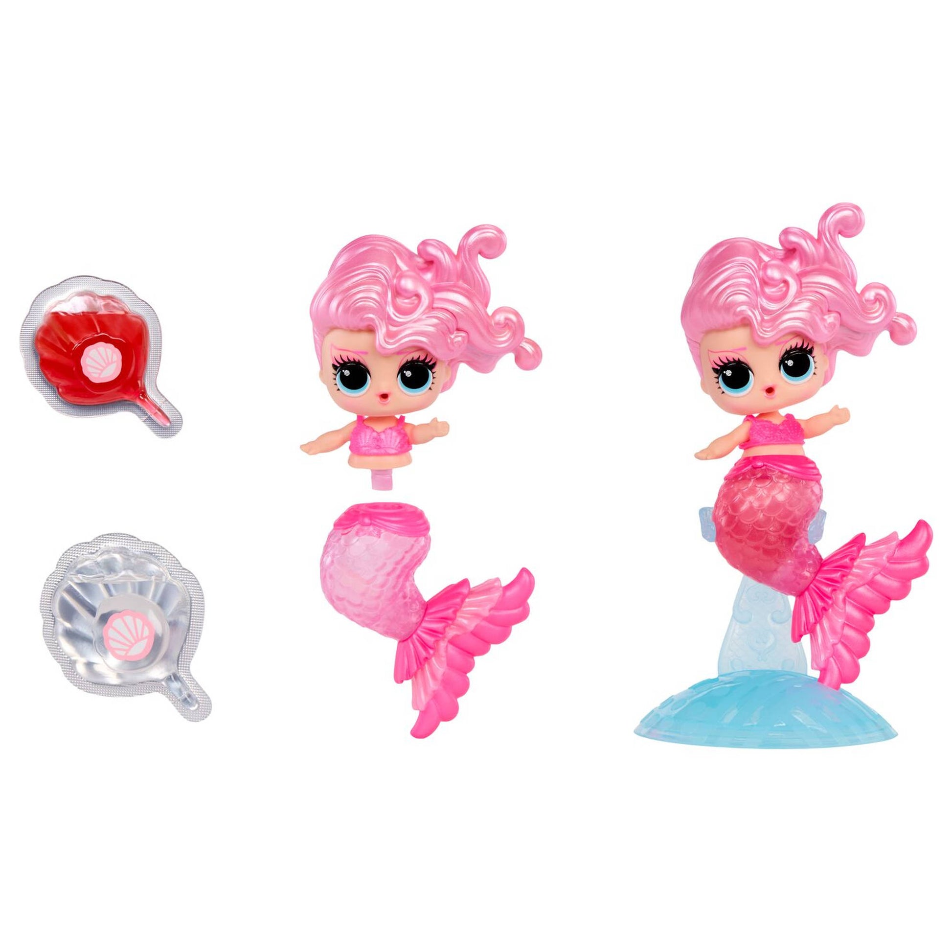 Unbox the magic by removing the shrink wrap and opening your ball, revealing your stylish mermaid, surprise accessories, and everything you need to create your custom lip gloss. Pour your two magical seashells filled with your DIY lip gloss into your doll’s clear mermaid tail, then watch as it transforms from clear to a dazzling new color - the ultimate before-and-after moment!