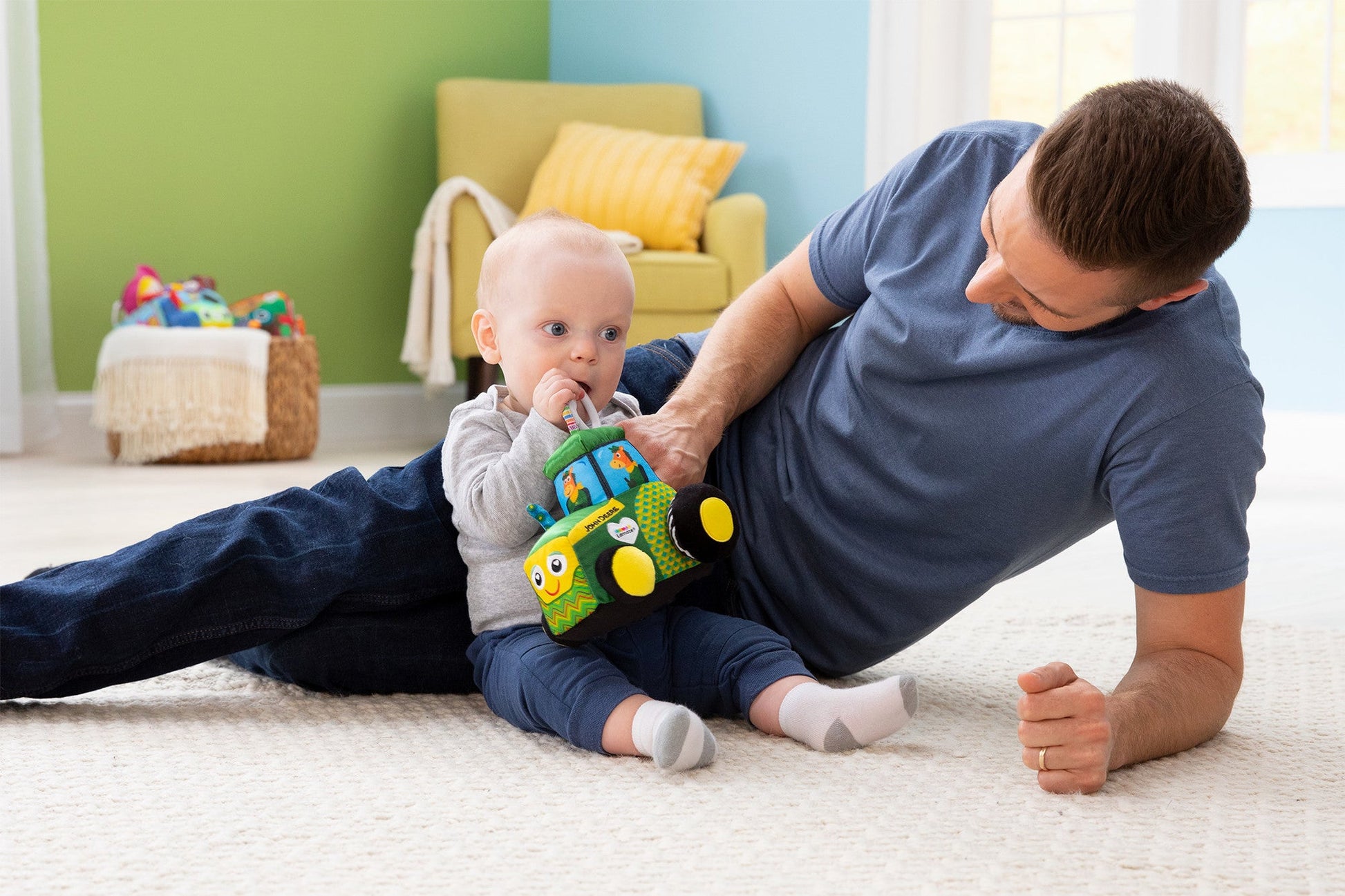 The Lamaze John Deere Tractor Clip & Go toy is full of developmental features to engage your baby. Turning the wheel creates intriguing clicking sounds to encourage auditory development. With interesting textures and crinkling sounds to explore, grabbing and squeezing this toy tractor is even more fun! High contrast patterns and bright colors provide your baby with visual stimulation during play time, and the Lamaze on-the-go clip lets you hook this cute baby toy to strollers, carriers and diaper bags for fun where ever you go.