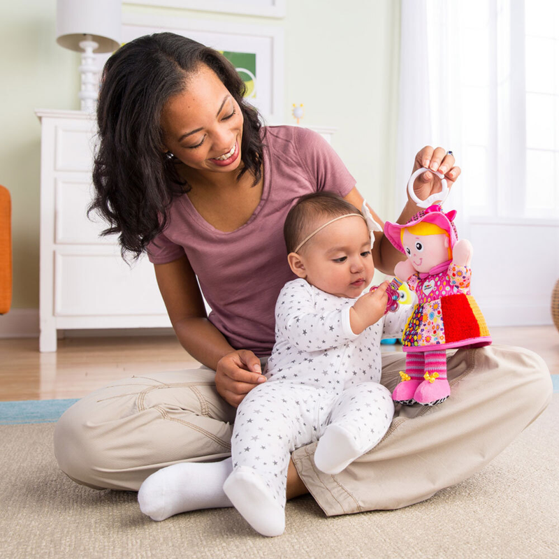 This lovely little doll is so cute ! She has a rattle necklace, clunky rings and interesting textures and sounds - great for sensory play!