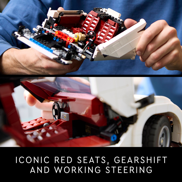 Features and functions – This LEGO® car model has a detailed cockpit with working steering, opening scissor doors, boot and rear bonnet, a detailed V12 engine, deep-dish alloy wheels and a large rear spoiler.