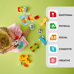 Build-and-rebuild toy train for creative play – Toddlers follow the cards to build the animal toys or use the extra bricks for constructing critters of their own invention