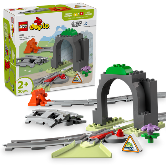 Train track toy set – Toddlers aged 2+ extend their LEGO® DUPLO® railway adventures and learn developmental skills with the Train Tunnel and Tracks Expansion Set.