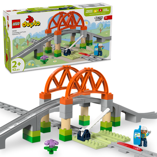 Train track toy set – Toddlers aged 2+ extend their LEGO® DUPLO® railway adventures and learn developmental skills with the Train Bridge and Tracks Expansion Set.