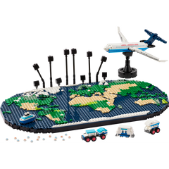 Dimensions – The 1,231-piece set includes a world map toy with plane and photo holders measuring over 14 cm (5.5 in.) high, 49 cm (19.5 in.) wide and 31 cm (12 in.) deep when combined in tabletop mode.