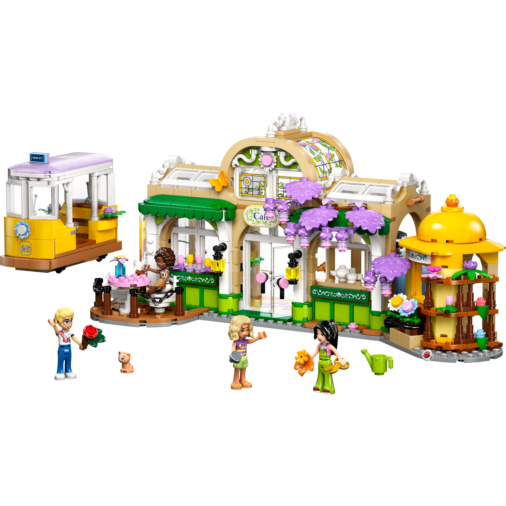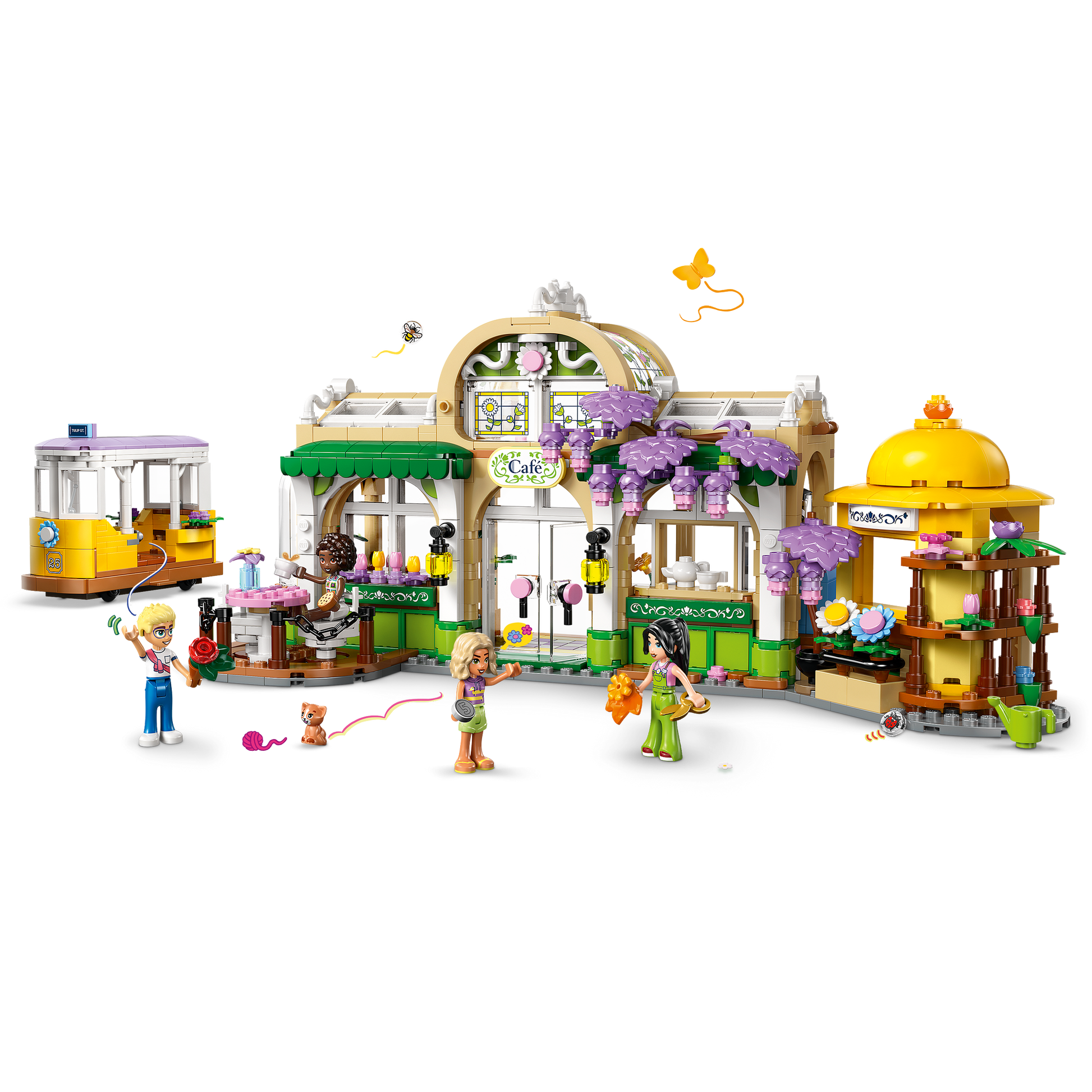 Pretend-play set for creative role play – This detailed LEGO® set includes different areas to inspire friendship stories, including a flower shop, café with outdoor seating, a kitchen and a tram.