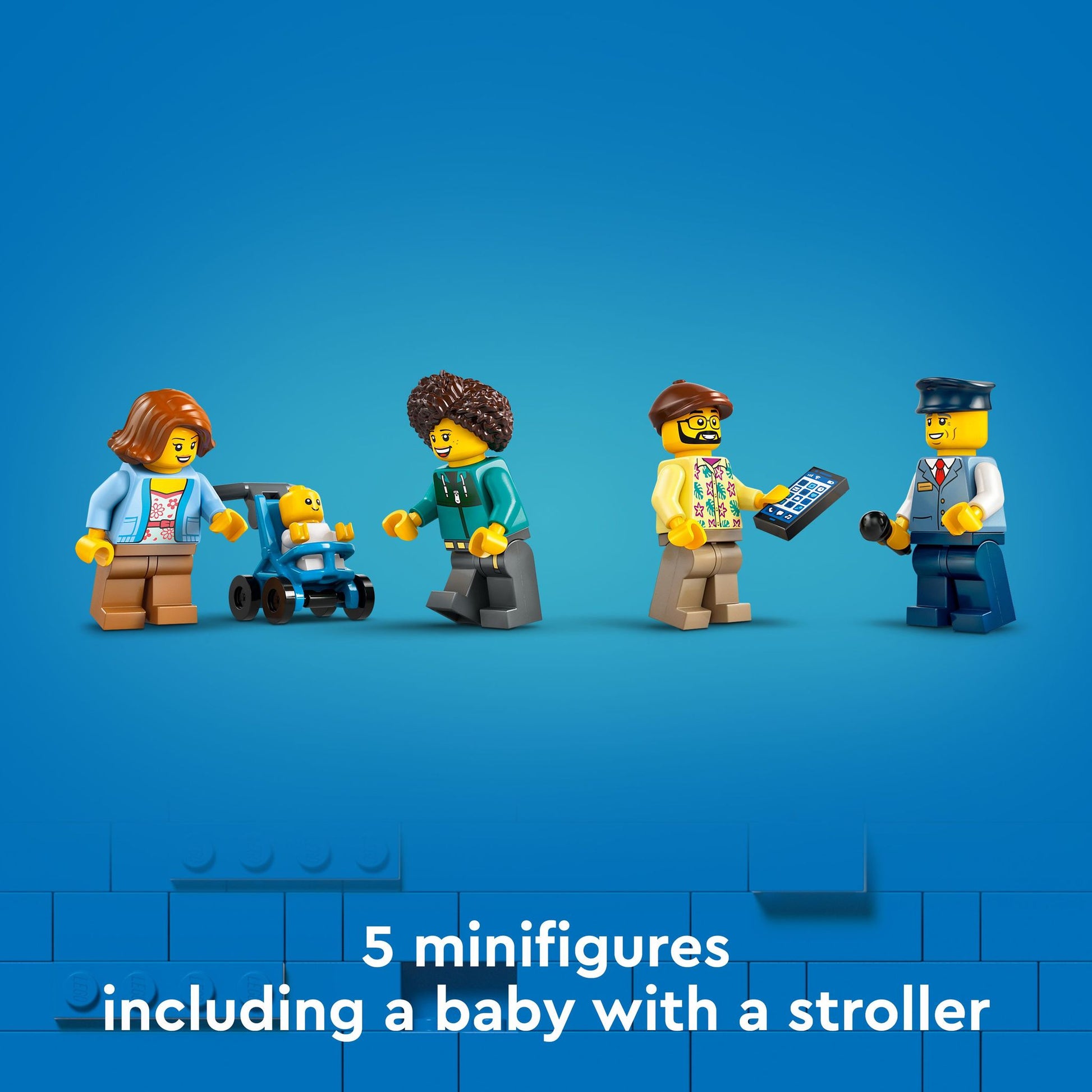 Hop on for a city tour aboard the double-decker sightseeing bus. Rotate the sign to display your destination. Choose from LEGO® City downtown, the harbor, museum or the park. Pick up waiting passengers along the way. Help secure the baby stroller in the spacious baggage area and seat passengers on the lower deck or the open-air sightseeing deck where they can enjoy a bird’s-eye view. Have fun!