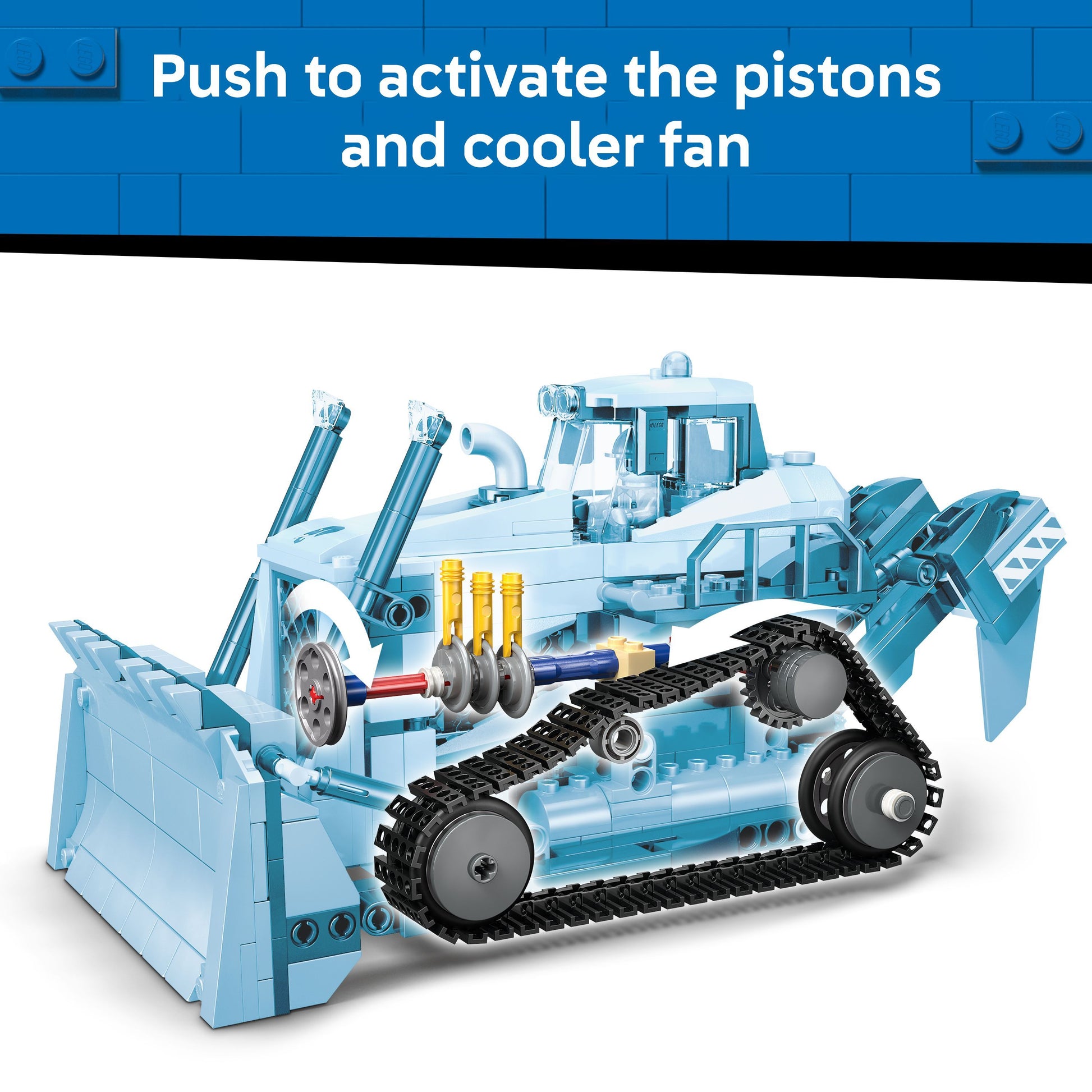 Toy bulldozer inspired by real vehicles and machines – Kids can raise the front blade and rear dual-shank ripper and push the vehicle to activate the visible moving pistons and spinning cooler fan