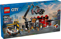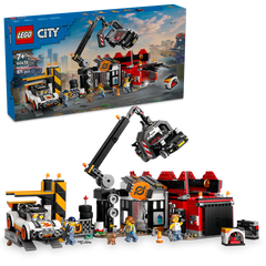 Welcome to the LEGO® City scrapyard, where the crew bring new life to old cars. Check out the shop selling salvaged spare parts, cool alloys and quality tyres at bargain prices! Grab a wrench from the tool chest and help dismantle parts from 2 classic ’80s cars. Then use the claw crane to hoist them into the crusher and press a lever to transform them into scrap metal cubes. Amazing!
