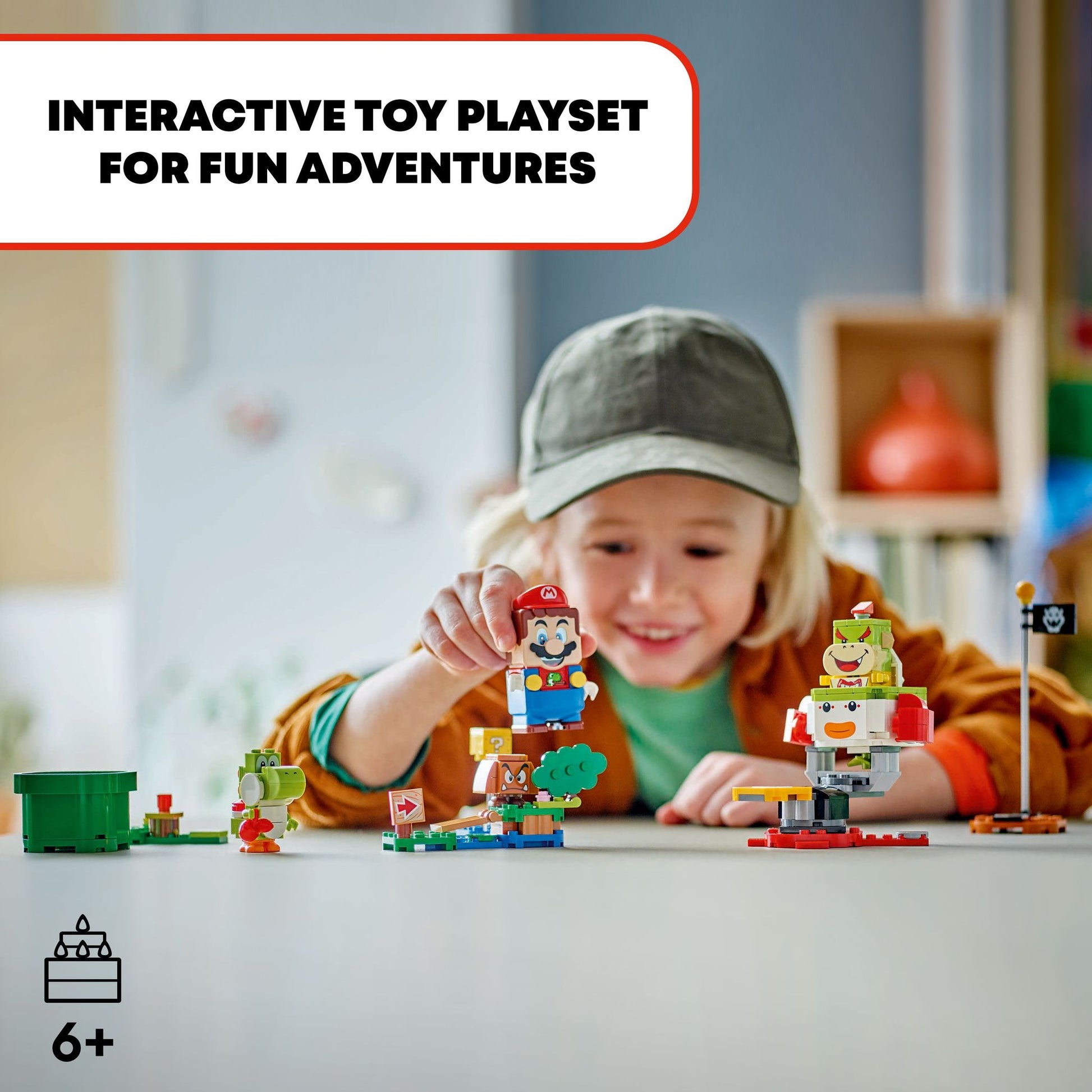 up with LEGO® Mario™ for an interactive, coin-collecting adventure! Begin at the Start Pipe and greet Yoshi. Defeat a Goomba and stomp on the ? Block, then take on Bowser Jr. Topple him off the platform and out of his Junior Clown Car, then ride away in the car to the Goal Pole!