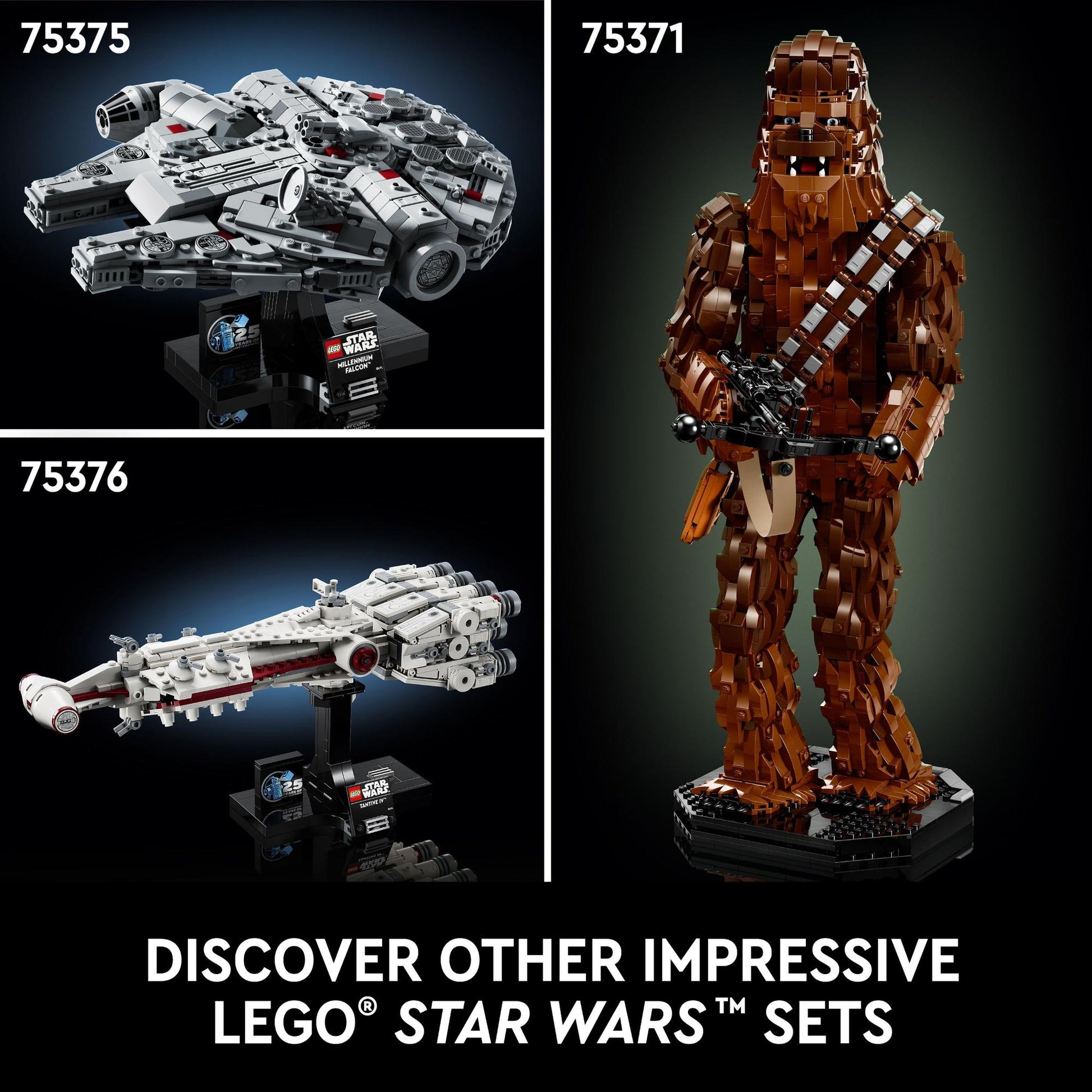 Made for display – The buildable stand has a nameplate and LEGO® Star Wars™ 25th anniversary brick, and it’s designed to display the Millennium Falcon at a dynamic angle