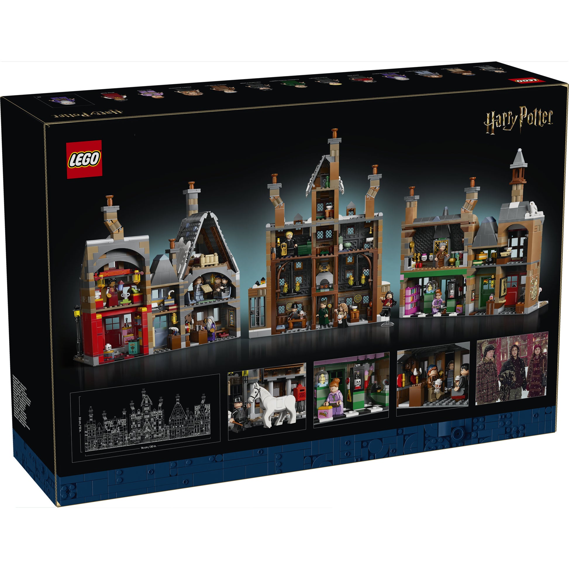 3 connectible modules, 7 buildings – Build the first-ever LEGO® builds of Zonko’s Joke Shop™ and the Hog’s Head™ pub, plus Honeydukes™, Scrivenshaft's Quill Shop™, Dervish and Banges™, and more